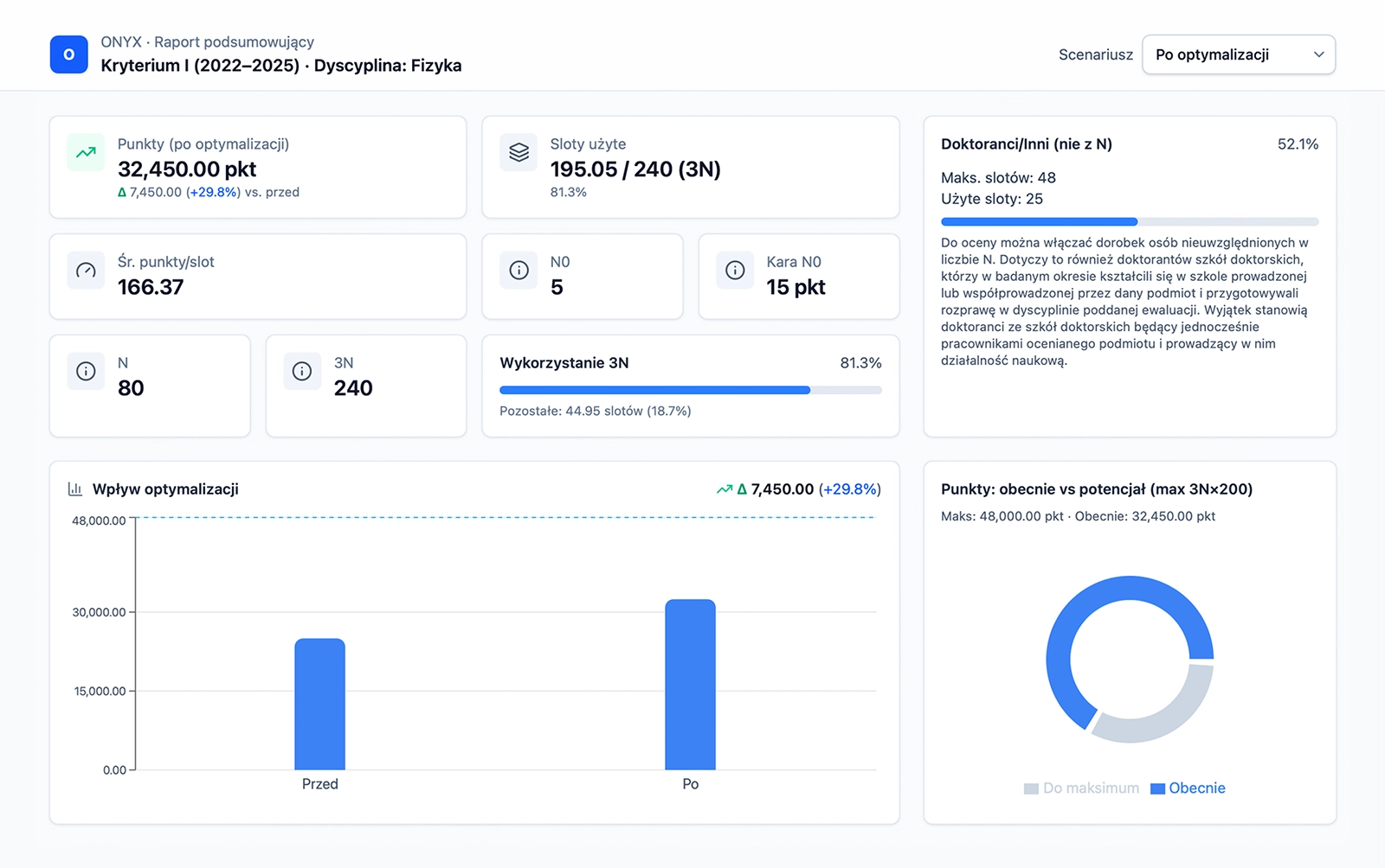 - Dzięki optymalizacji jednostka może uzyskać więcej punktów niż przy standardowym rozliczeniu. Te dodatkowe punkty często decydują o wyższej kategorii naukowej przyznanej dyscyplinie (np. awans z kategorii B+ do A) lub pozwalają obronić obecną kategorię przed spadkiem. Wyższa kategoria to z kolei większy prestiż, wyższe finansowanie oraz utrzymanie kluczowych uprawnień (np. nadawania stopni naukowych).